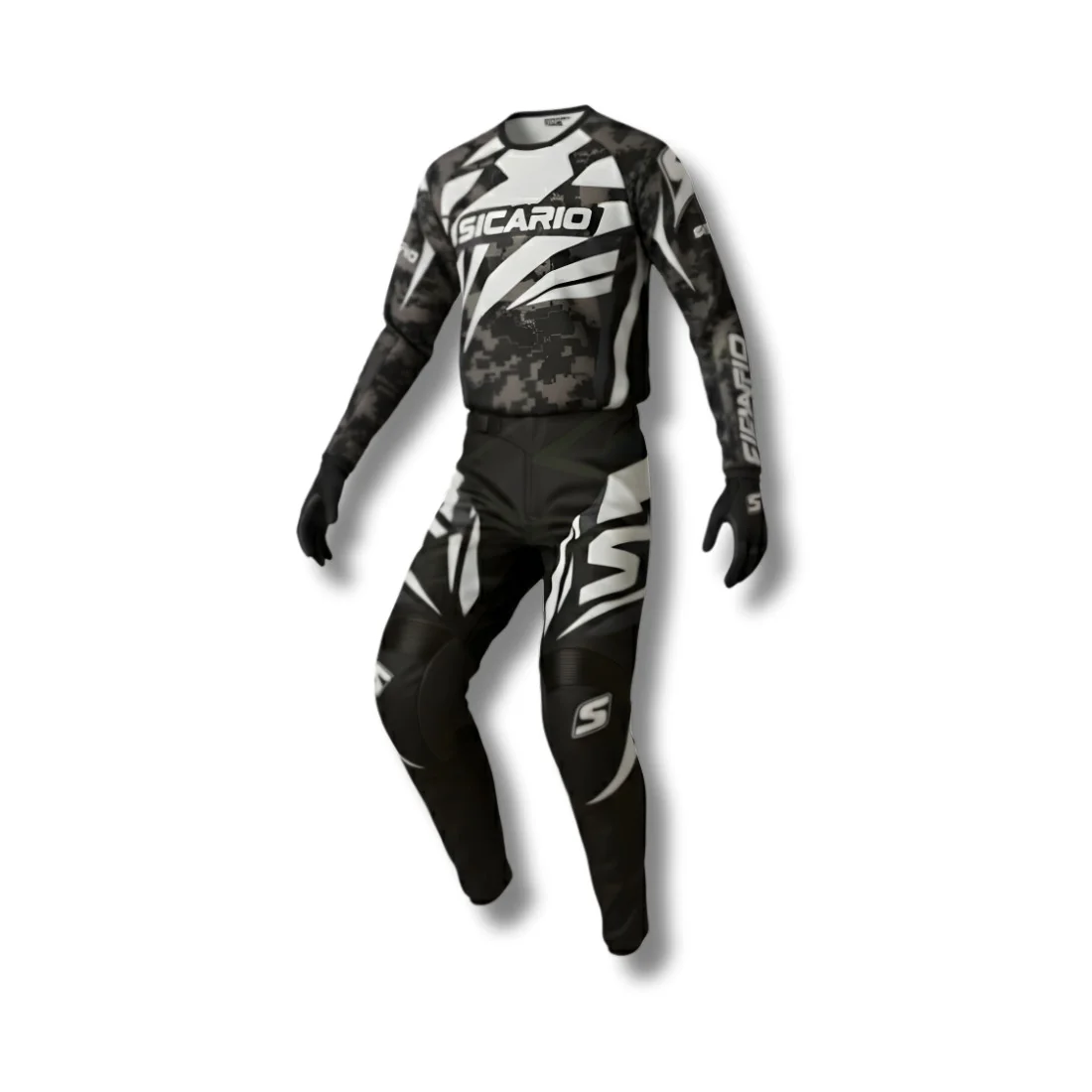 Iconic Digital Camo Style & Unlimited Personalization: Make a strategic statement with the SMX-3410’s unique Digital Camo design, available in commanding Black & White, bold Blue, aggressive Red, and vibrant Green. The sharp graphics and distinctive Sicario branding are applied using high-definition sublimation, guaranteeing vibrant, fade-resistant colors that will endure season after season. Go beyond the standard and truly define your identity on the track by utilizing our customization options: add your personal brand logos, team emblems, and custom rider numbers, creating a truly unique and powerful racing kit that reflects your winning spirit and tactical style!