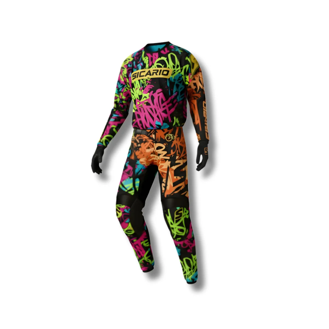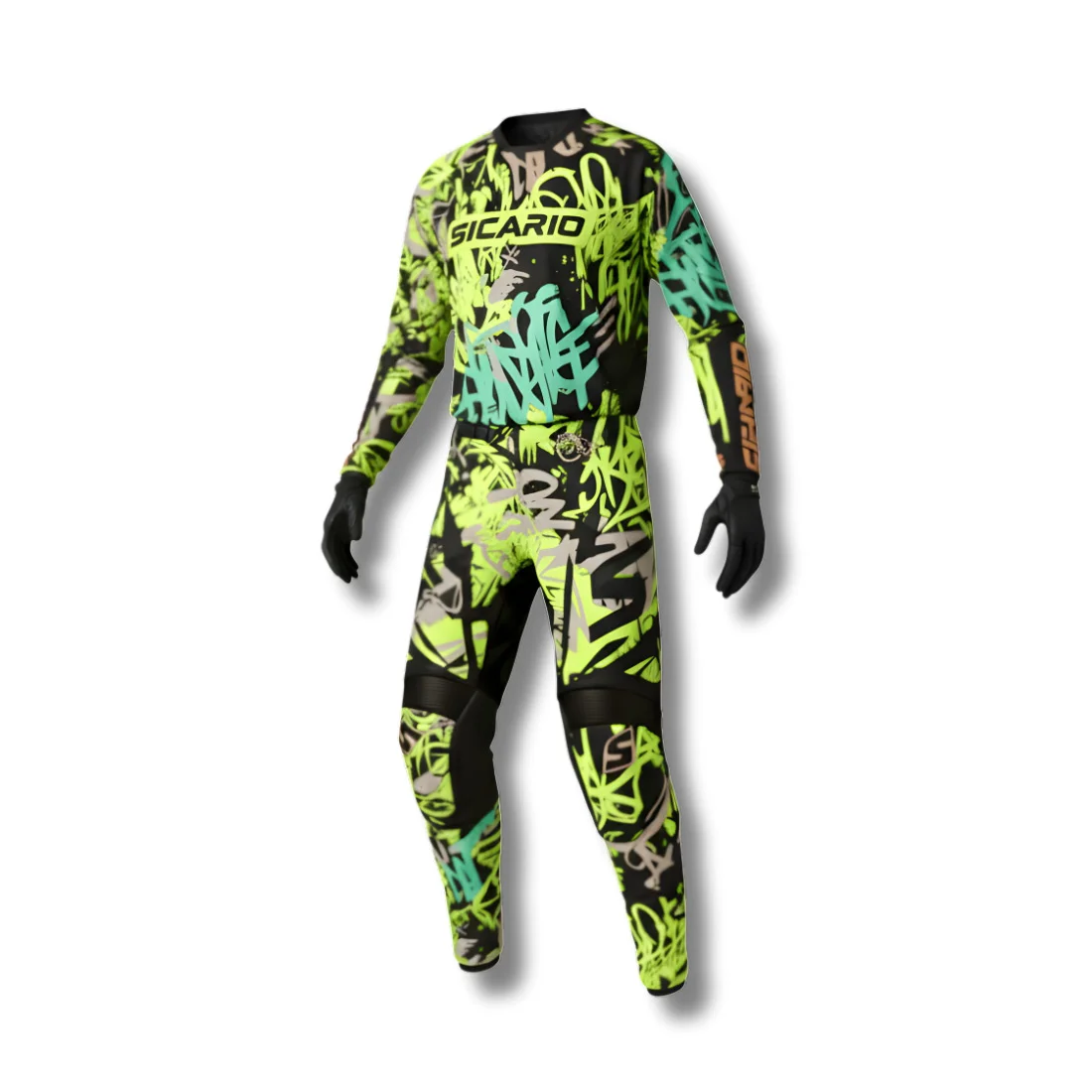 Sicario SMX-3409 Motocross Gear | Graffiti MX Race Suit | Custom Dirt Bike Apparel | Fluo Green, Multi Orange, Black & White | Made-to-Measure Off-Road Kit