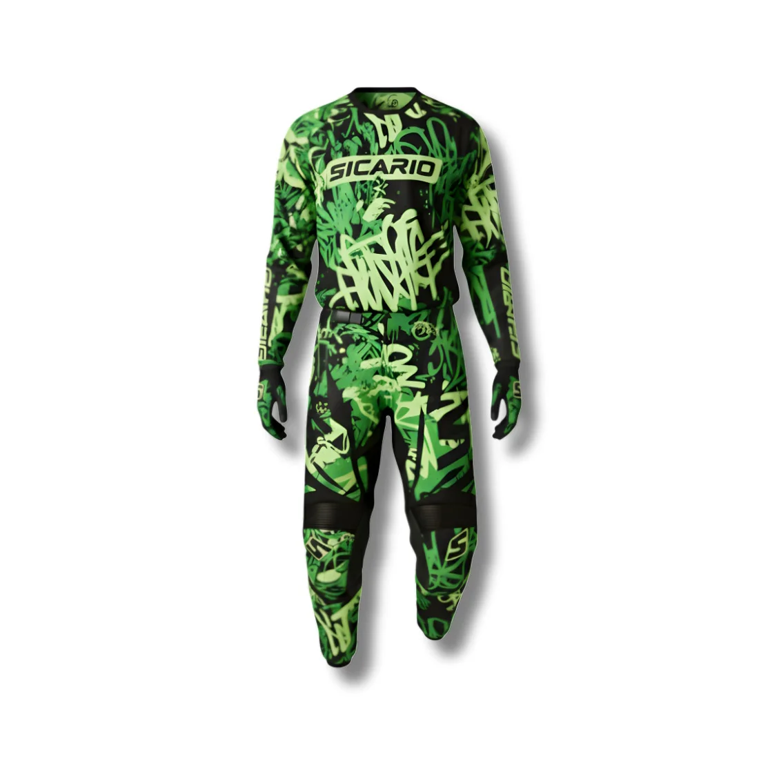 Iconic Graffiti Style & Unlimited Personalization: Make a statement with the SMX-3409’s unique “Graffiti” design, available in electrifying Fluo Green, vibrant Multi Orange, and classic Black & White. The sharp graphics and distinctive Sicario branding are applied using high-definition sublimation, guaranteeing vibrant, fade-resistant colors that will endure season after season. Go beyond the standard and truly define your identity on the track by utilizing our customization options: add your personal brand logos, team emblems, and custom rider numbers, creating a truly unique and powerful racing kit that reflects your winning spirit and individual style!